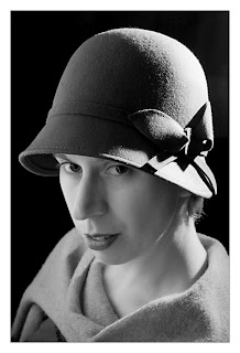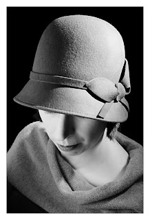 In this one the light is positioned at 90 degrees to Sian, rather than behind, increasing the prominence of the hat in the shot. As with the first shot, this used a single flash and a large white board reflector. The aim here was to create something a little more subtle and unusual by hiding more of the face and just showing the eyelashes below the brim of the hat.